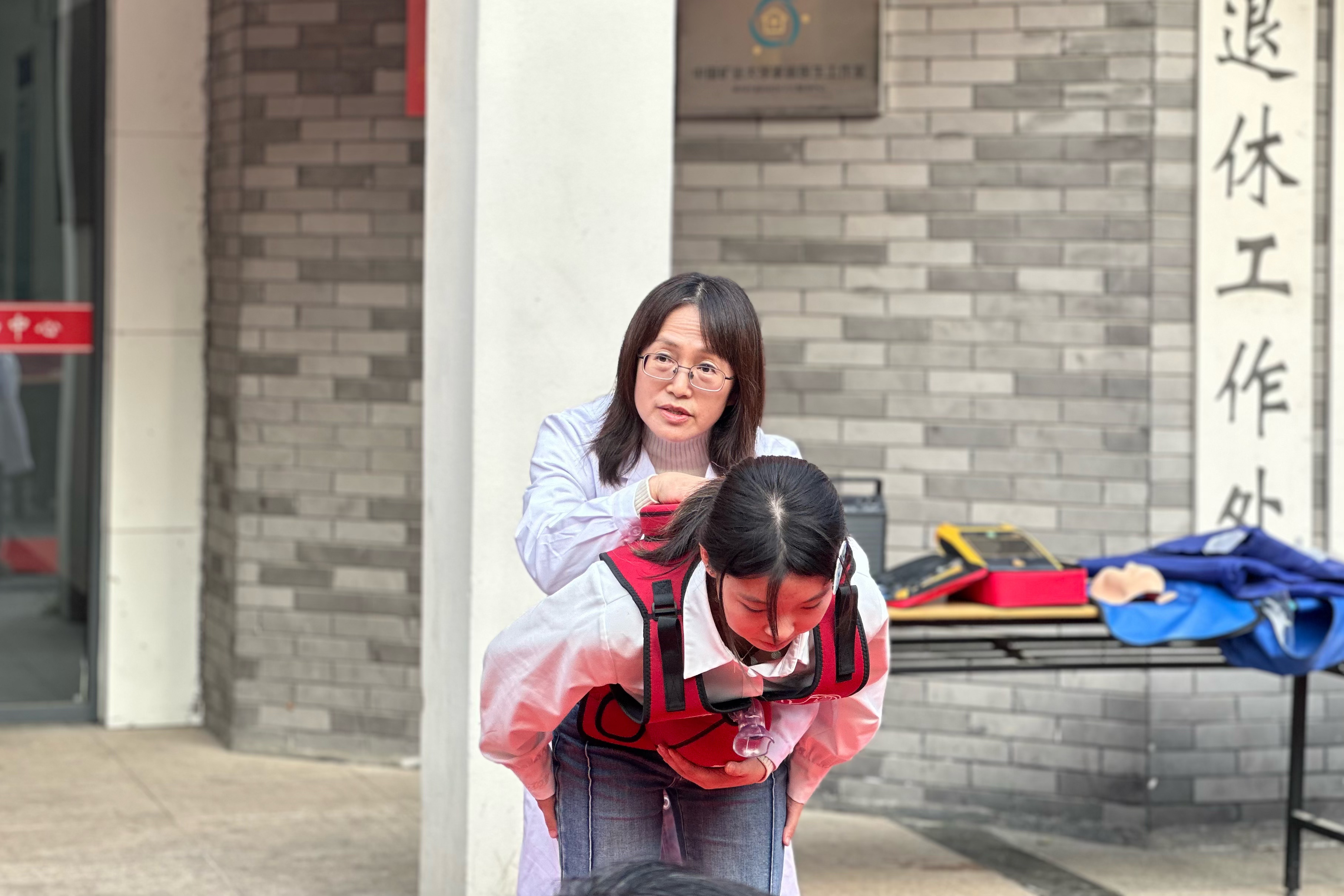 随后,矿业工程学院急救培训师贾润月结合模拟人等实物教具,系统讲解心肺复苏(CPR)的操作规范,重点强调30:2的按压与呼吸比例、每分钟100-120次的按压频率及人工呼吸的正确姿势。同时,现场演示自动体外除颤仪(AED)的开机、电极片粘贴、除颤操作等流程,让参与者直观了解设备使用的关键环节。