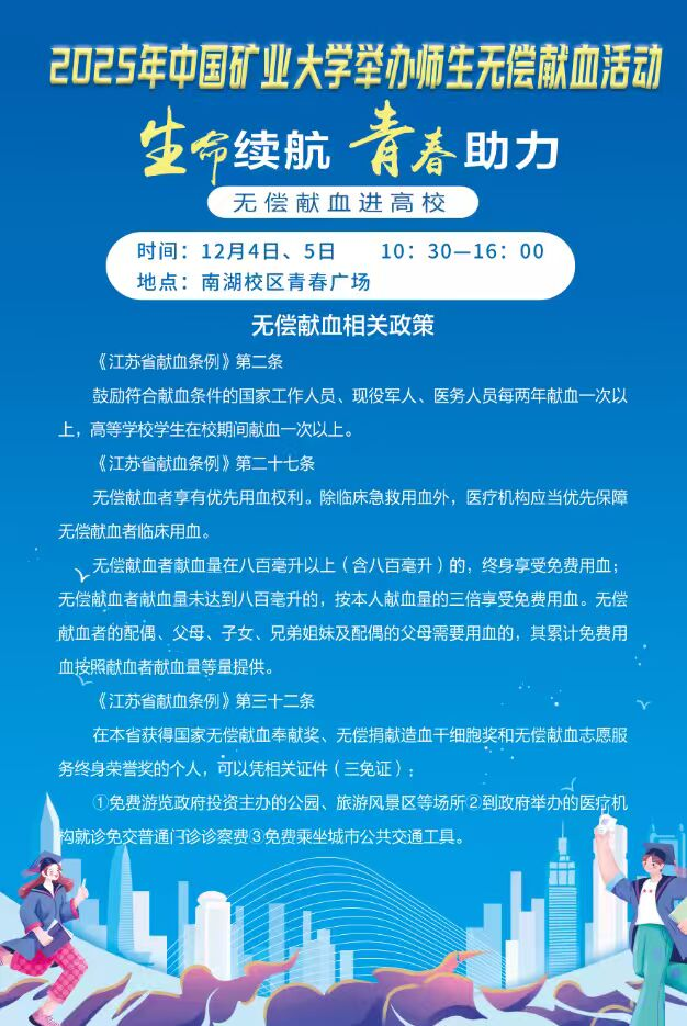 为弘扬无私奉献的崇高精神,凝聚社会向善的正能量,中国矿业大学校医院、校团委等部门携手徐州市红十字血液中心,于12 月4、5日在南湖校区青春广场,成功举办“生命续航,青春助力” 师生无偿献血公益活动。活动吸引了广大师生员工积极响应、踊跃参与,大家以滚烫热血为生命接力,用实际行动践行着青春的责任与担当。